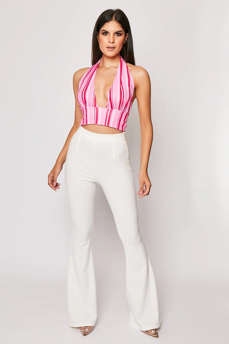 Love the bright pink tones and halter-neck cut. Featuring a deep plunge and soft ribbed material, with an elasticated back. Wear with our white Lucy trousers and pair of heels for a look that will have all eyes on you.