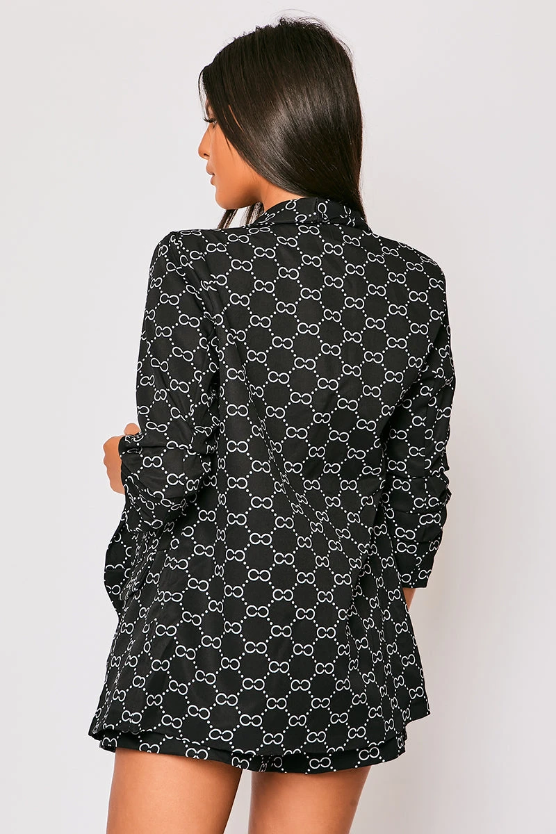 Classic black outfit hues are perfect for any occasion and this co-ord is weekend brunch essential. Featuring an all over nude monogram design, high waisted shorts with a belted finish and a matching blazer with ruched sleeve detailing. Model is 5ft6 wearing a size 8.