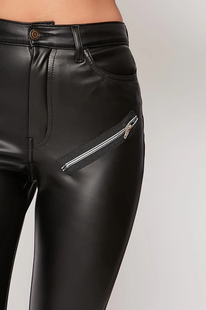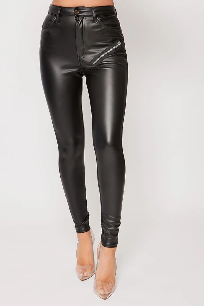 Give your outfit of the day a bold edge with these PU skinny jeans. Featuring a comfortable stretch and flattering high waisted fit.