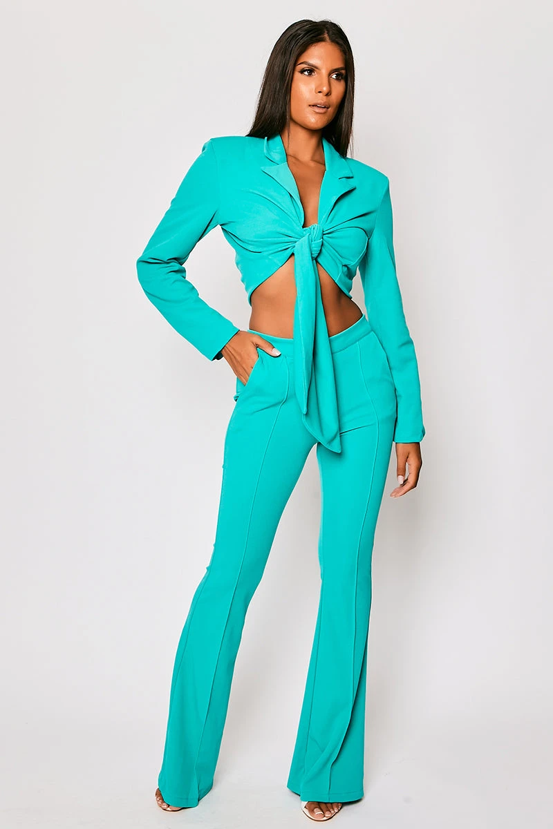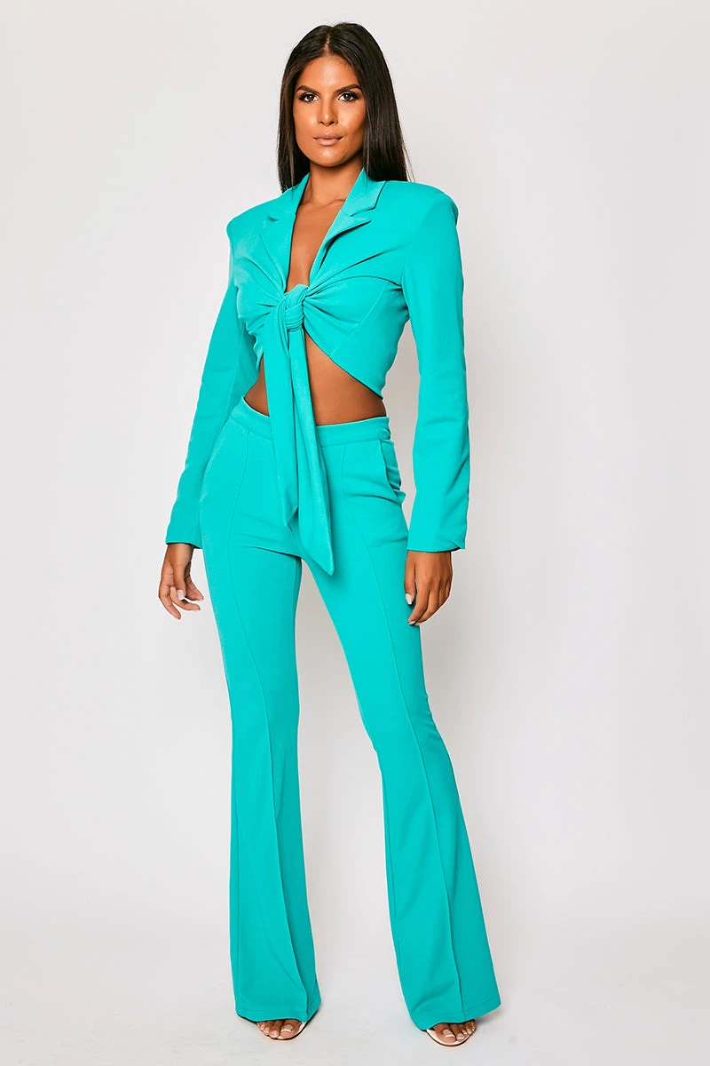 Up your fashion game and channel ultimate girl boss style vibes in the Blair tie front cropped blazer and bell bottom trousers!