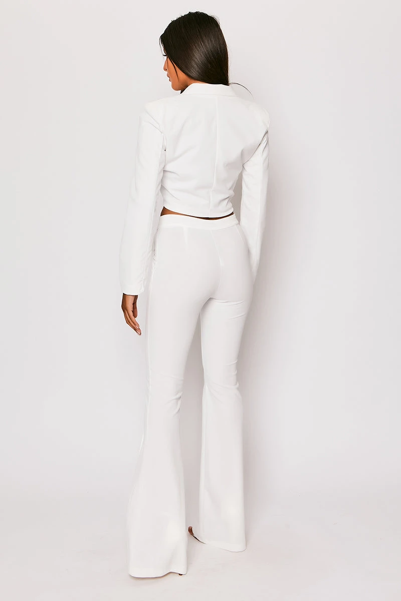 Up your fashion game and channel ultimate girl boss style vibes in the Blair tie front cropped blazer and bell bottom trousers!