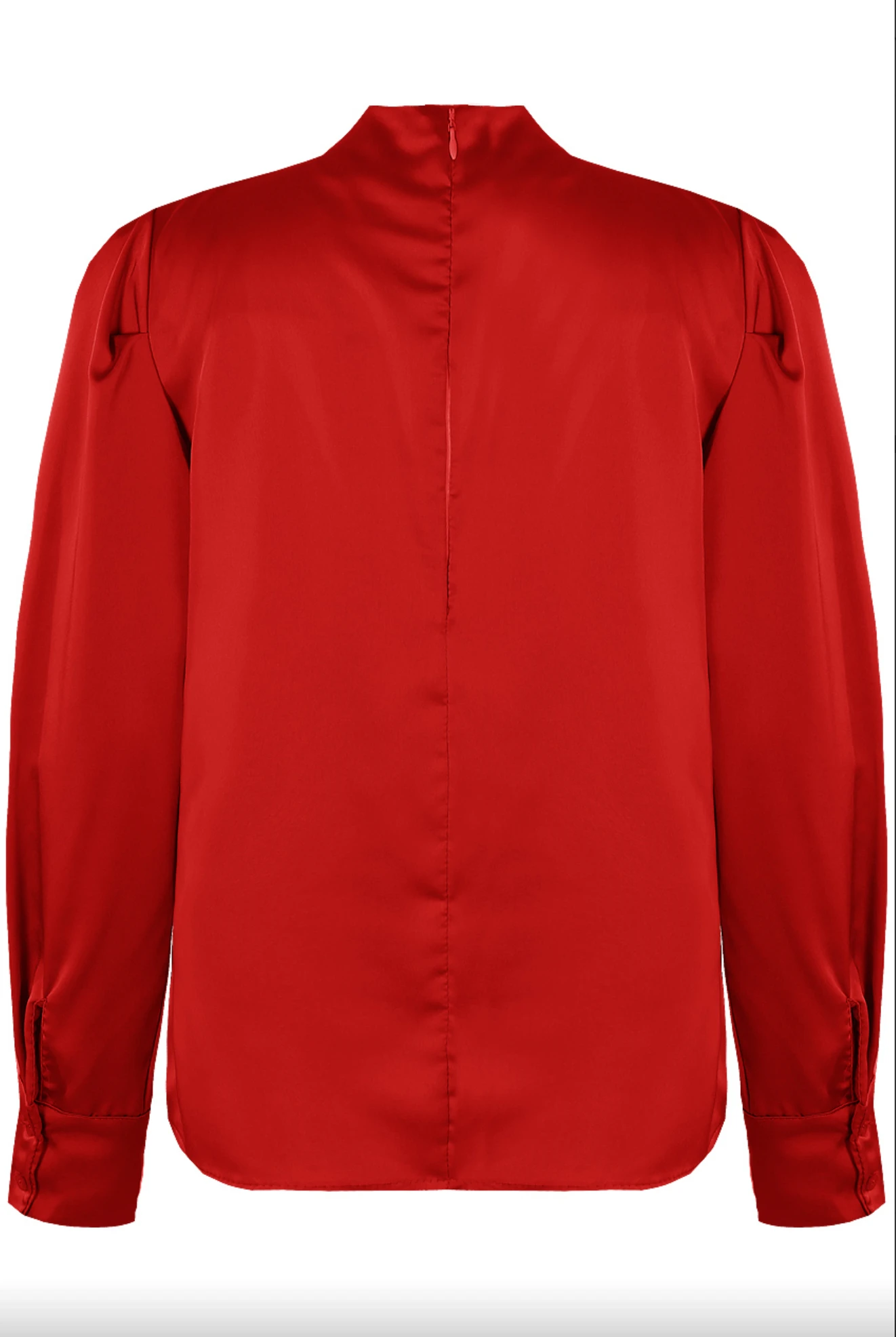 Cloey – Red Satin Pleated Blouse & Gold Button Detail