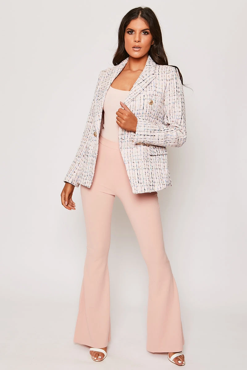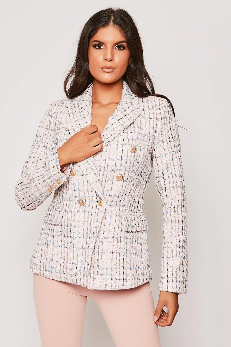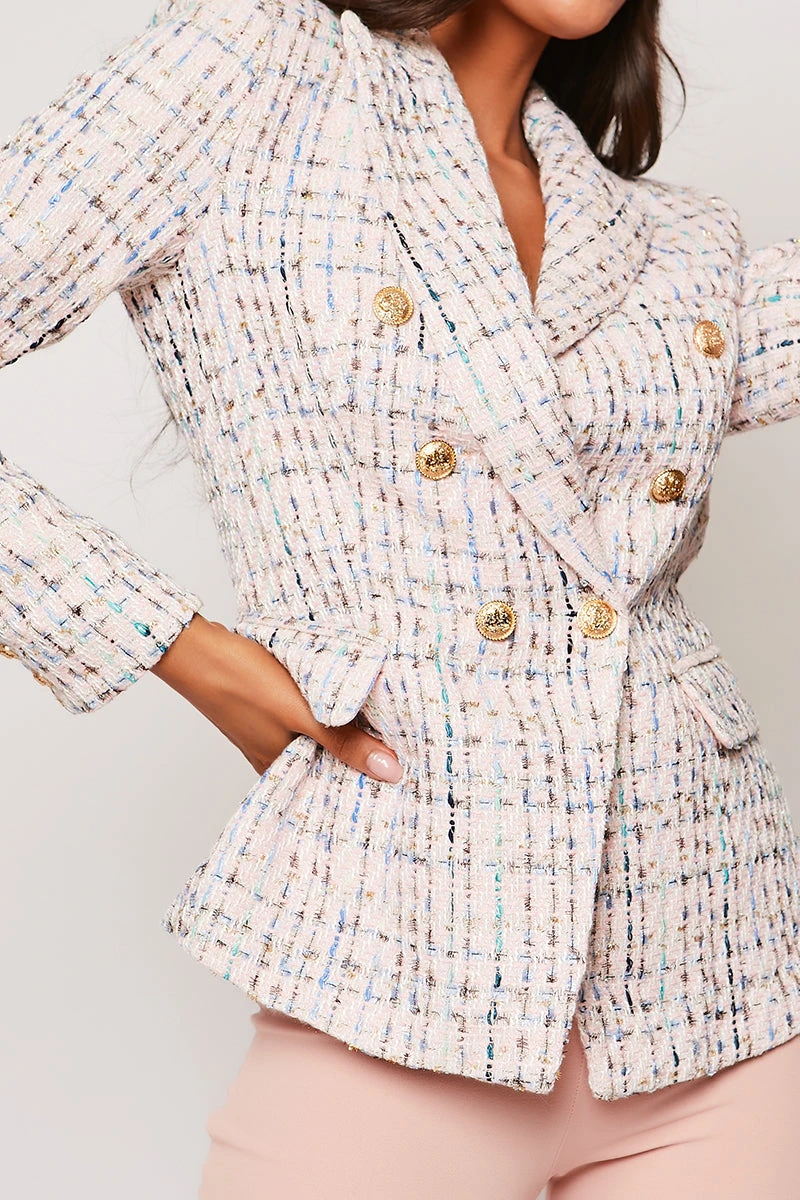 Love the luxe texture and gold button detail. This pink tweed style blazer features a double breast styling, peak lapels & size flapped pockets.