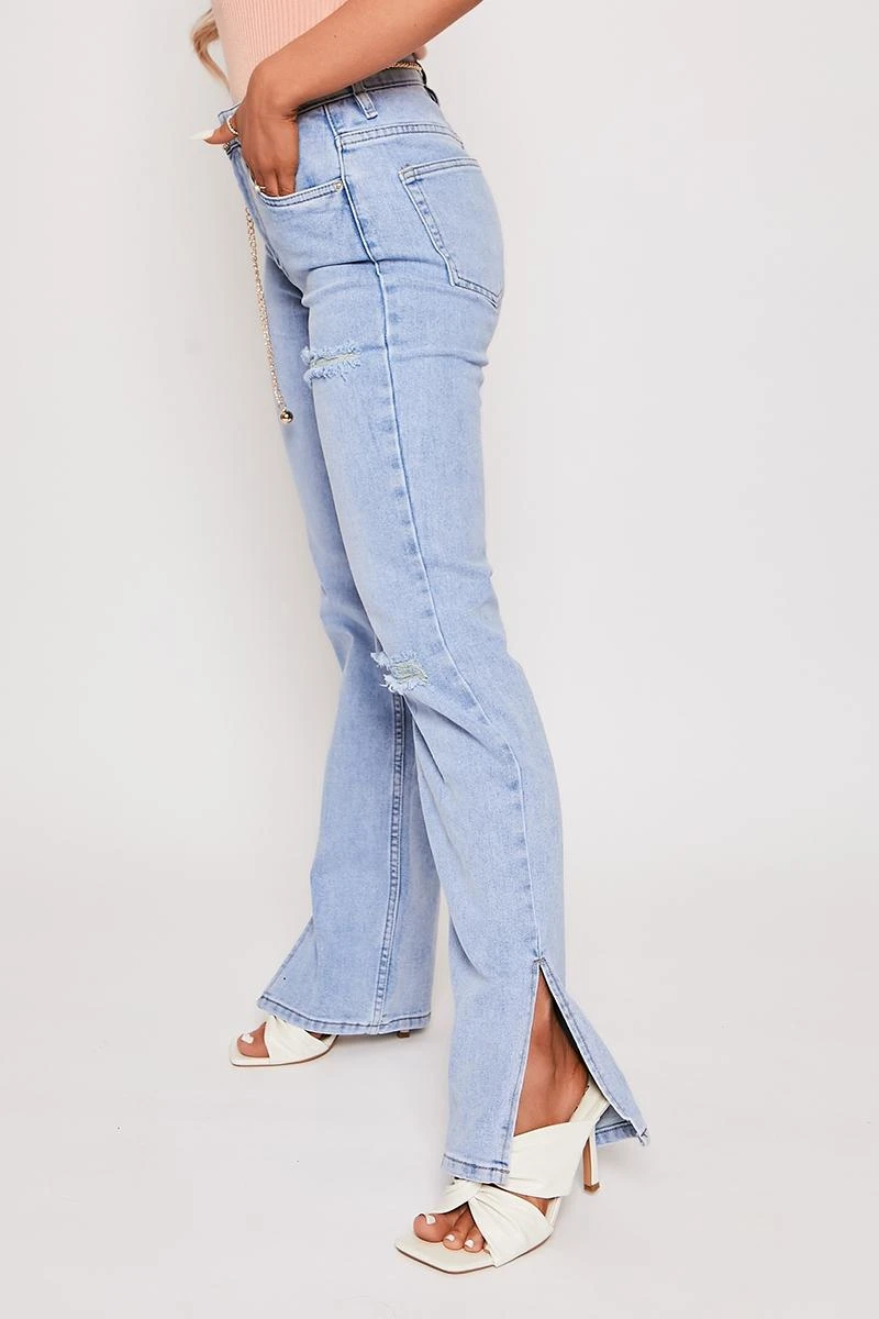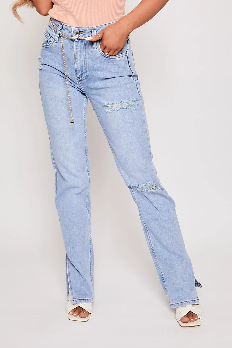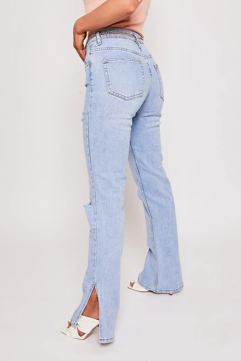 Featuring a light blue wash denim with a mom style fit, ripped details and belted finish (Belt included)