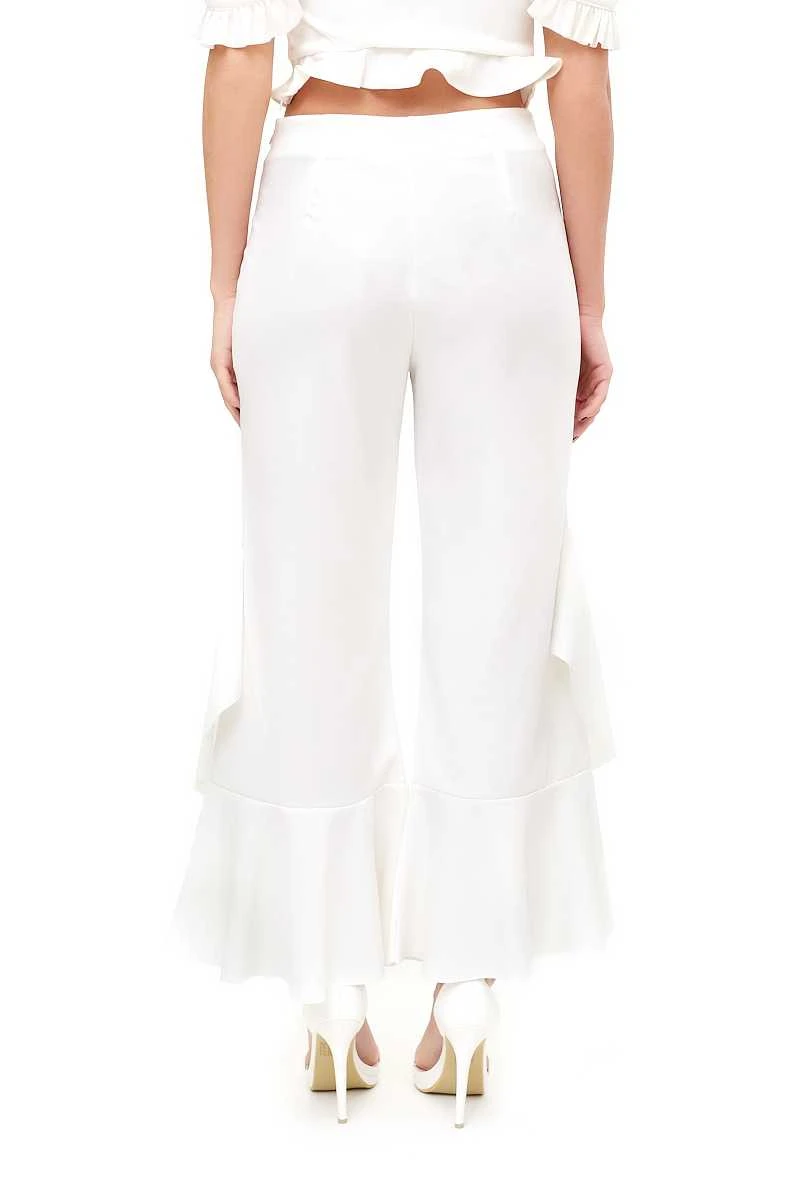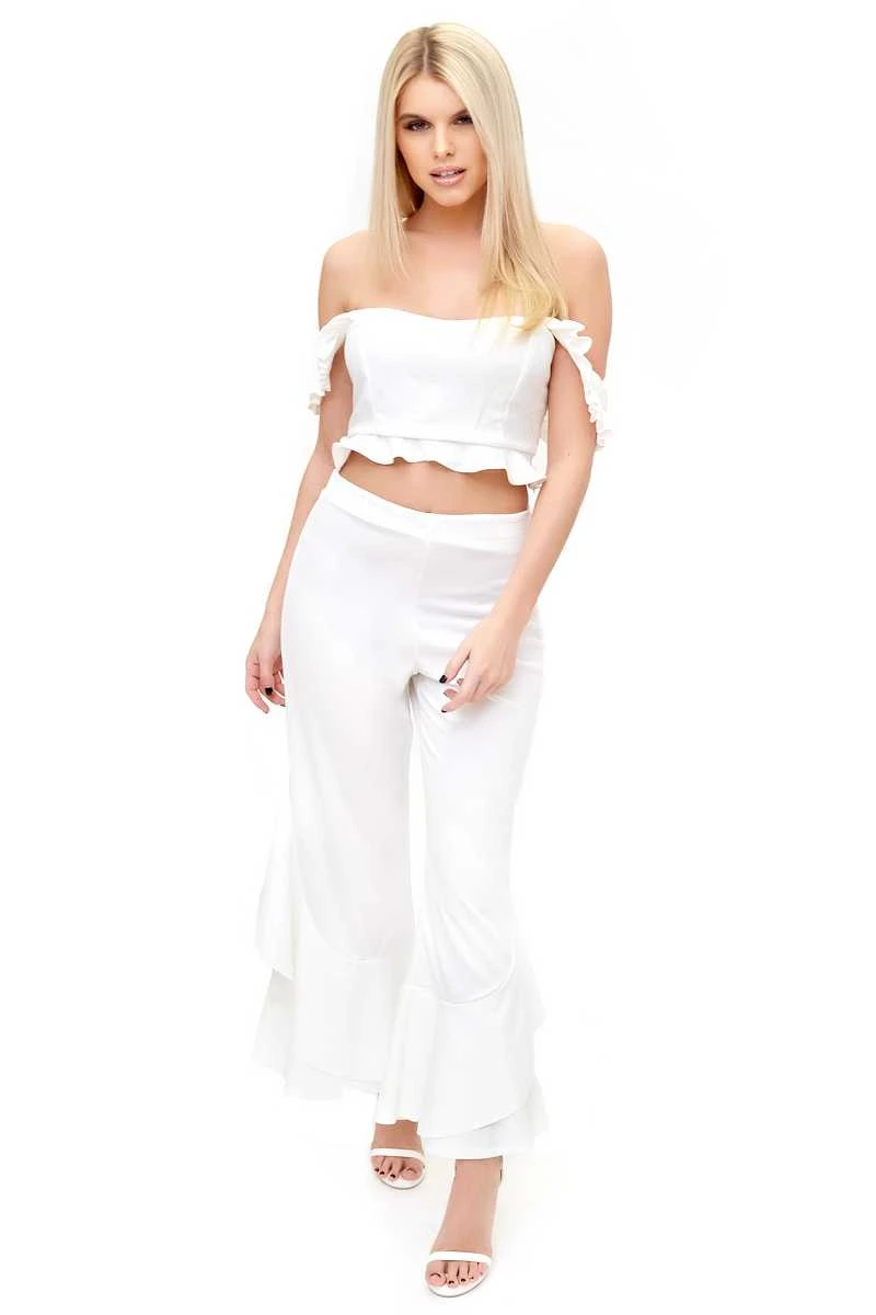 Flossie is oh so chic! Gorgeous white trousers with a asymmetric side draped frill. With a side zip fastening and high waisted fit. Model is 5ft5 wearing a size 8.