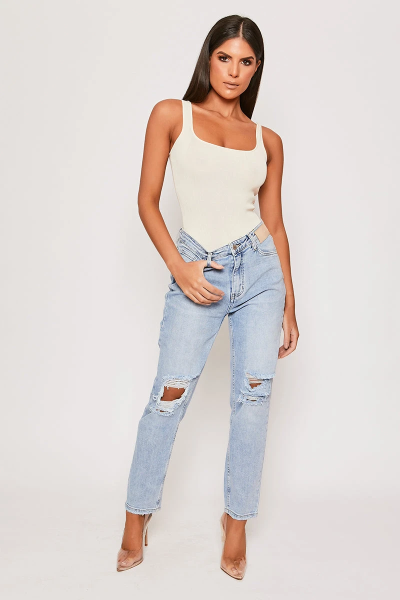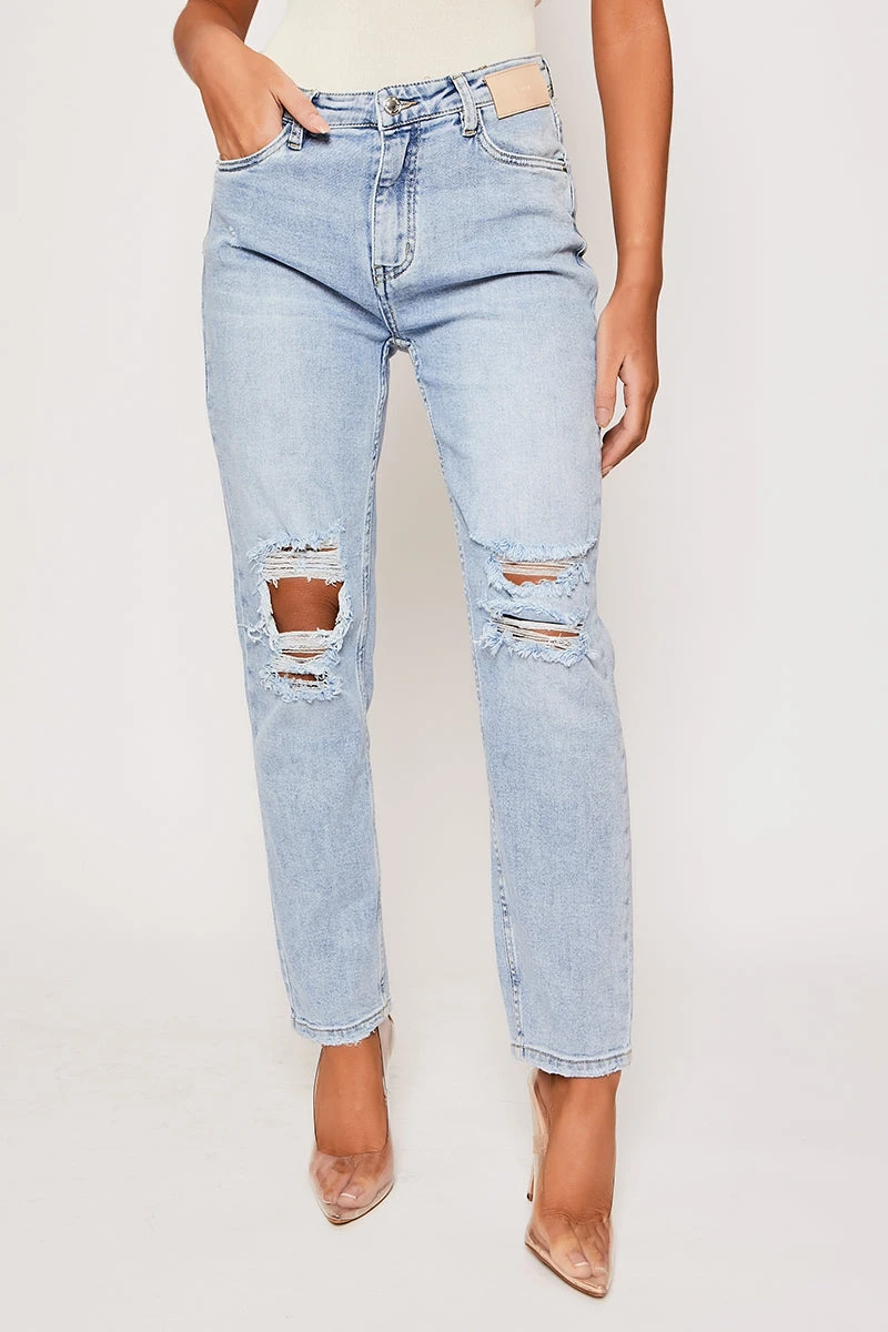 Obsessed over Franca. Featuring a light wash denim material, distressed detailing and mom fit. Model is 5ft6 wearing a size 8.