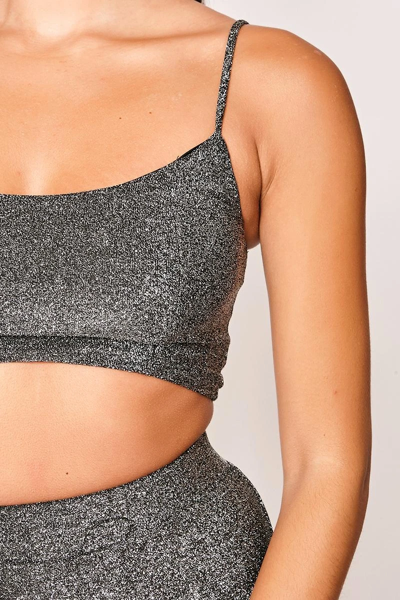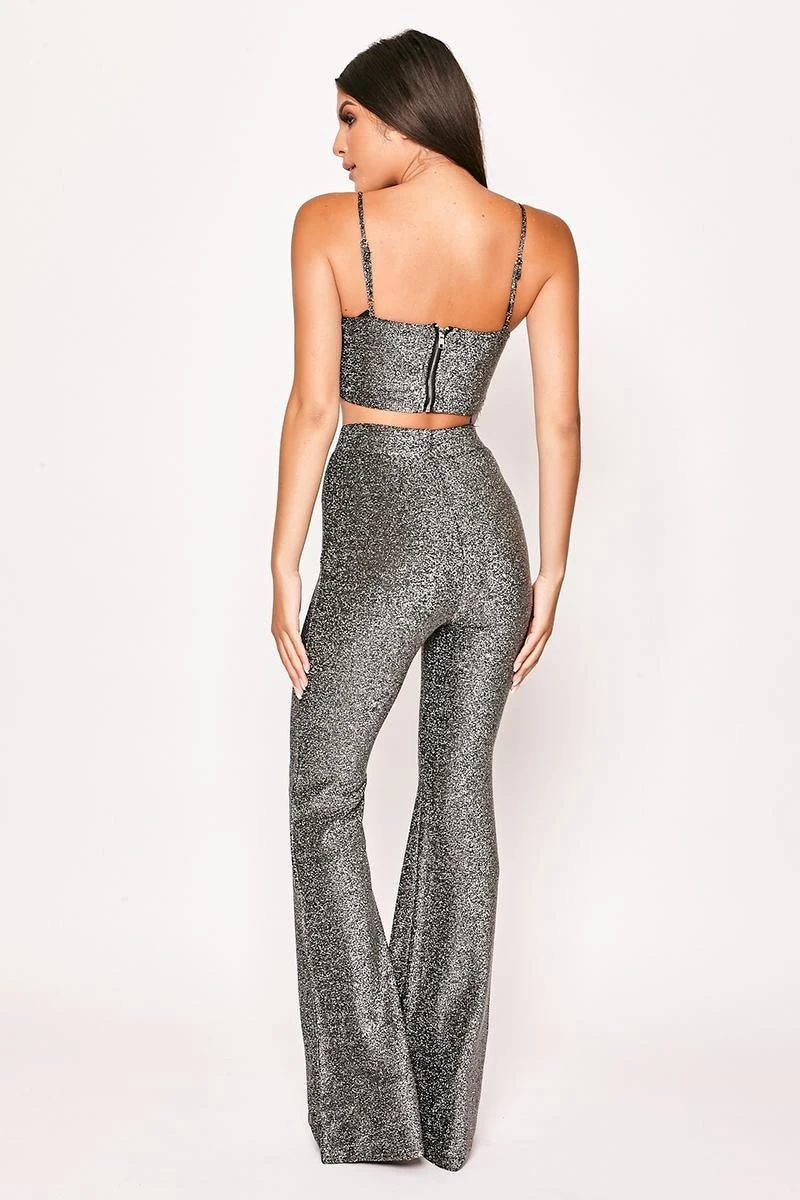 Adore the luxe silver sparkling tone of this two piece set! Featuring a crop top, matching high waisted trousers and a bell bottom finish. Made from lurex glitter material.