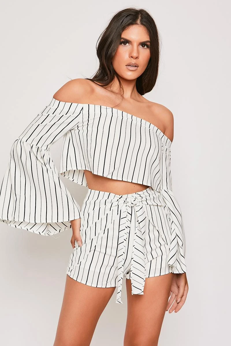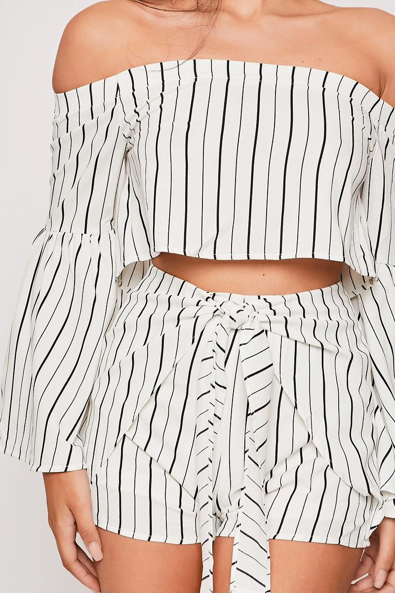 Love Harriets classic off the shoulder cut and pin stripe design, featuring long bell sleeves and matching high waisted shorts with a front tie detail. Style with out white Clover heels to complete the look! Model is 5ft6 wearing a size 8.