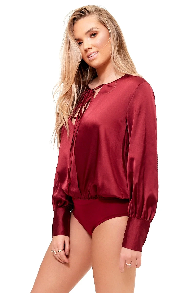 Jeanie – Wine Satin Wrap Front Bodysuit