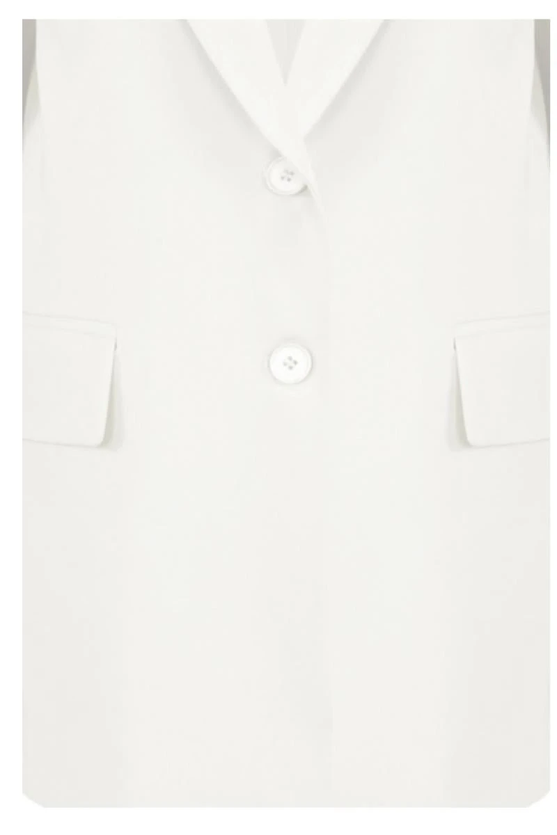 Crisp white hue double breasted blazer featuring long sleeves with buttoned cuffs and a tailored cut.