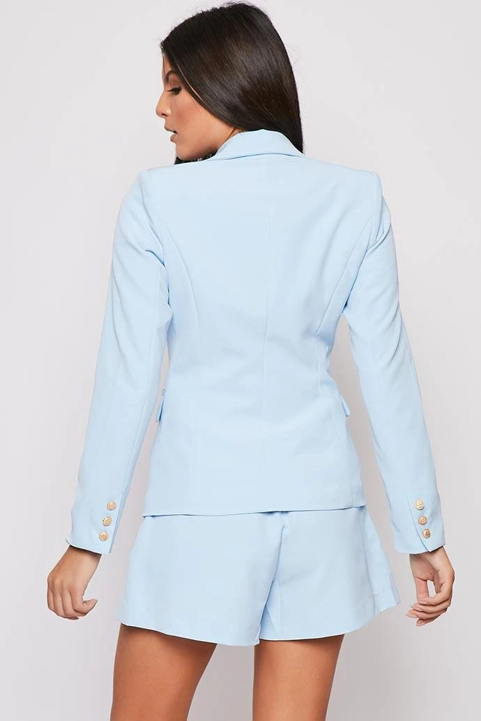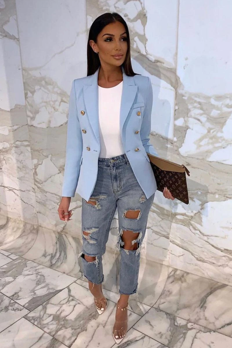 Love Rafal’s gorgeous baby blue hue and gold button detailing! You’ll be channeling sophisticated vibes in this oh so chic style!