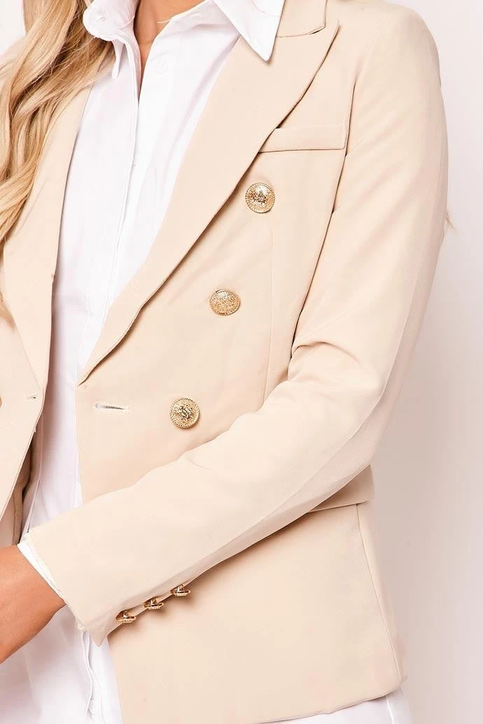 Love Rafal’s creamy nude hue and gold button detailing! You’ll be channeling sophisticated vibes in this oh so chic style!