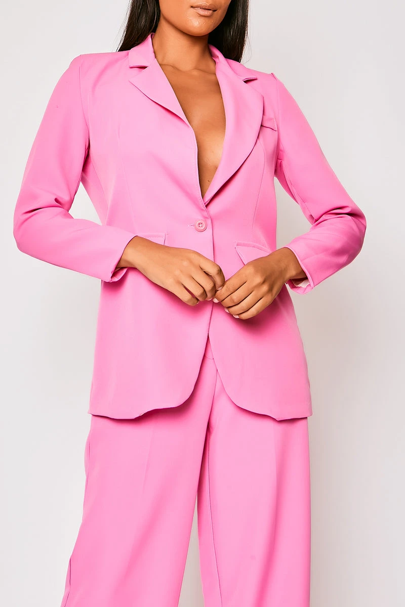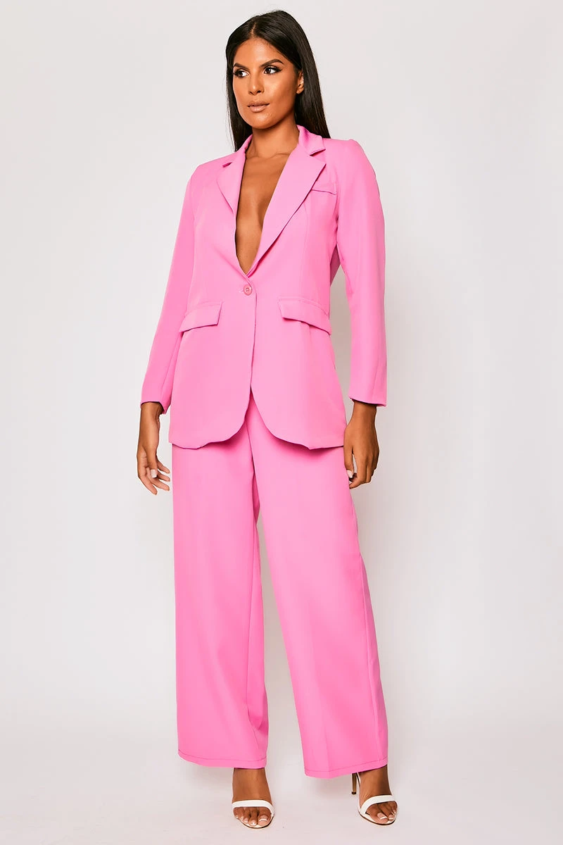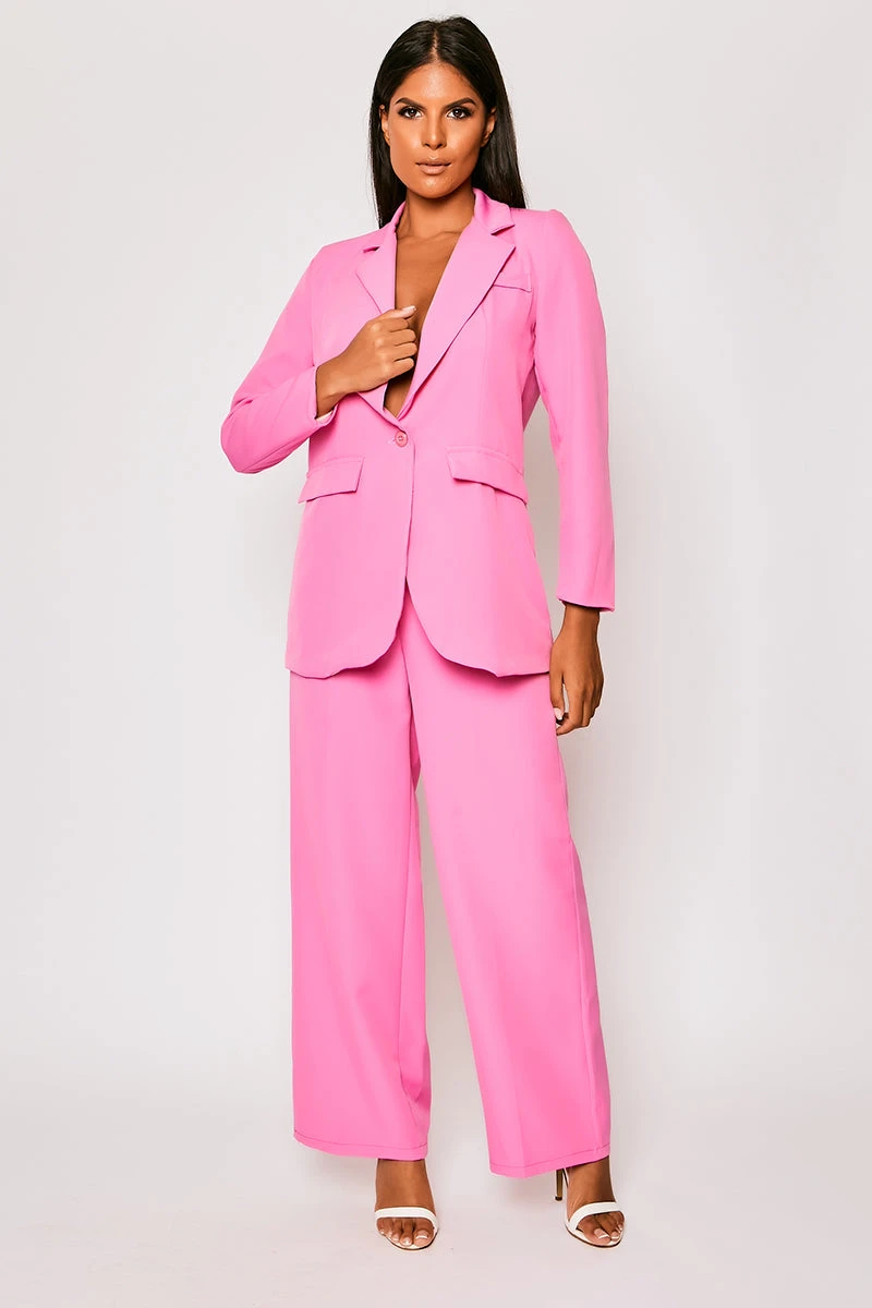 Mix fierce with feminine by heading out in this blazer co-ord. Featuring a bubblegum pink material with a double-breasted design and high waisted wide leg trousers. Model is 5ft6 wearing a size 8.