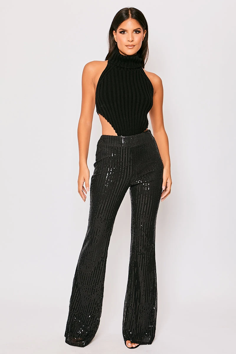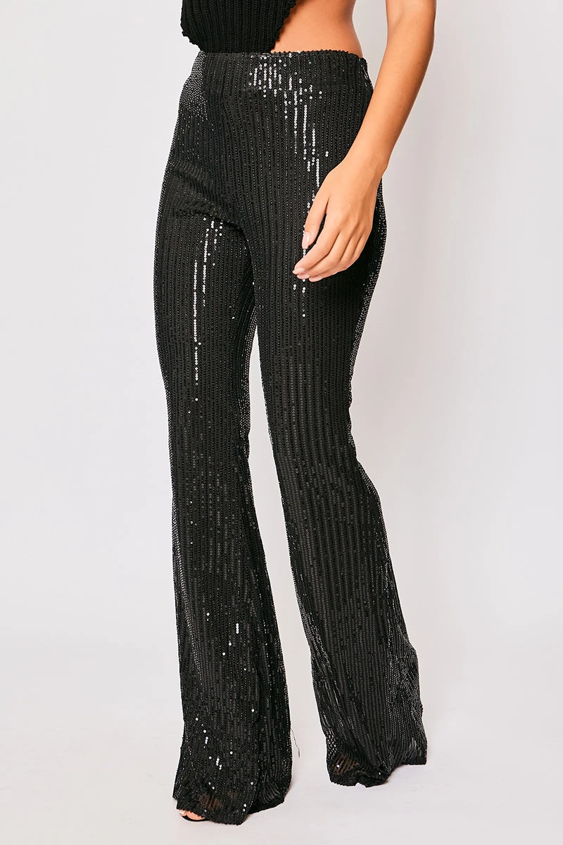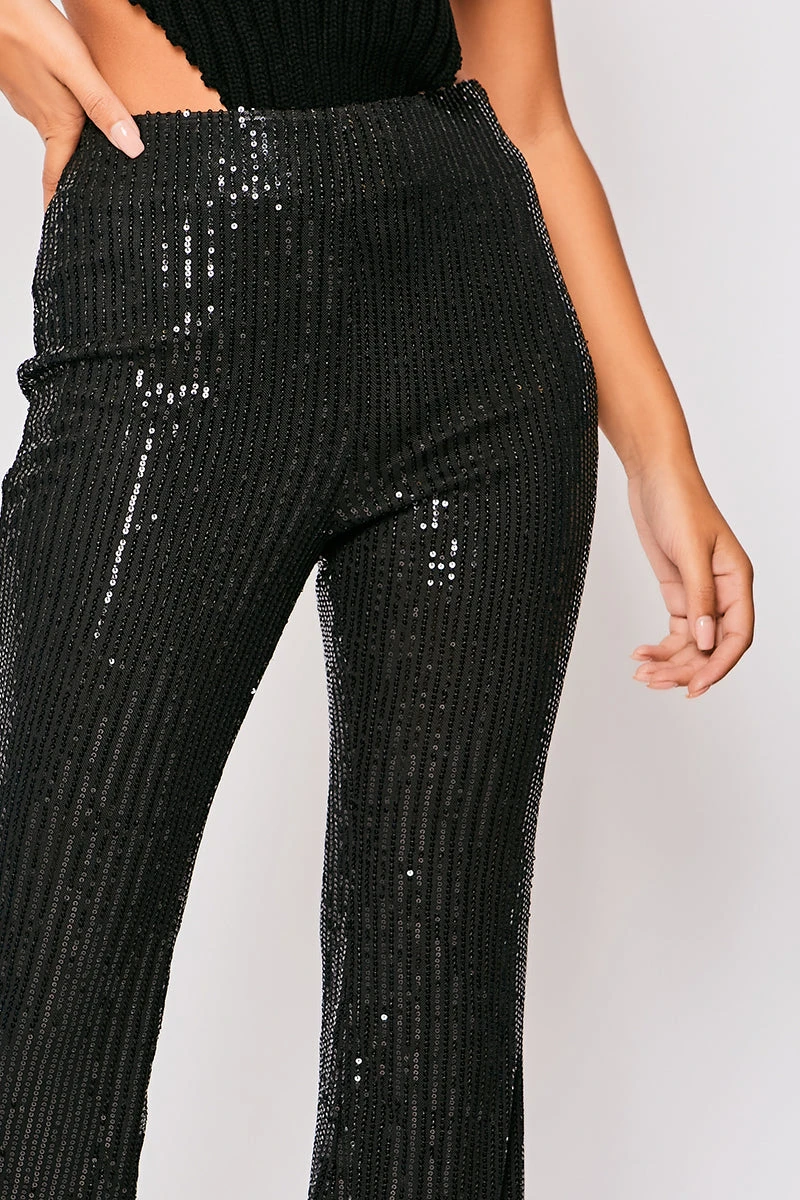 Dazzle in Reegan! Adorned in hundreds of light catching sequins. These black sequin high waisted trousers are finished perfectly with a flare finish.