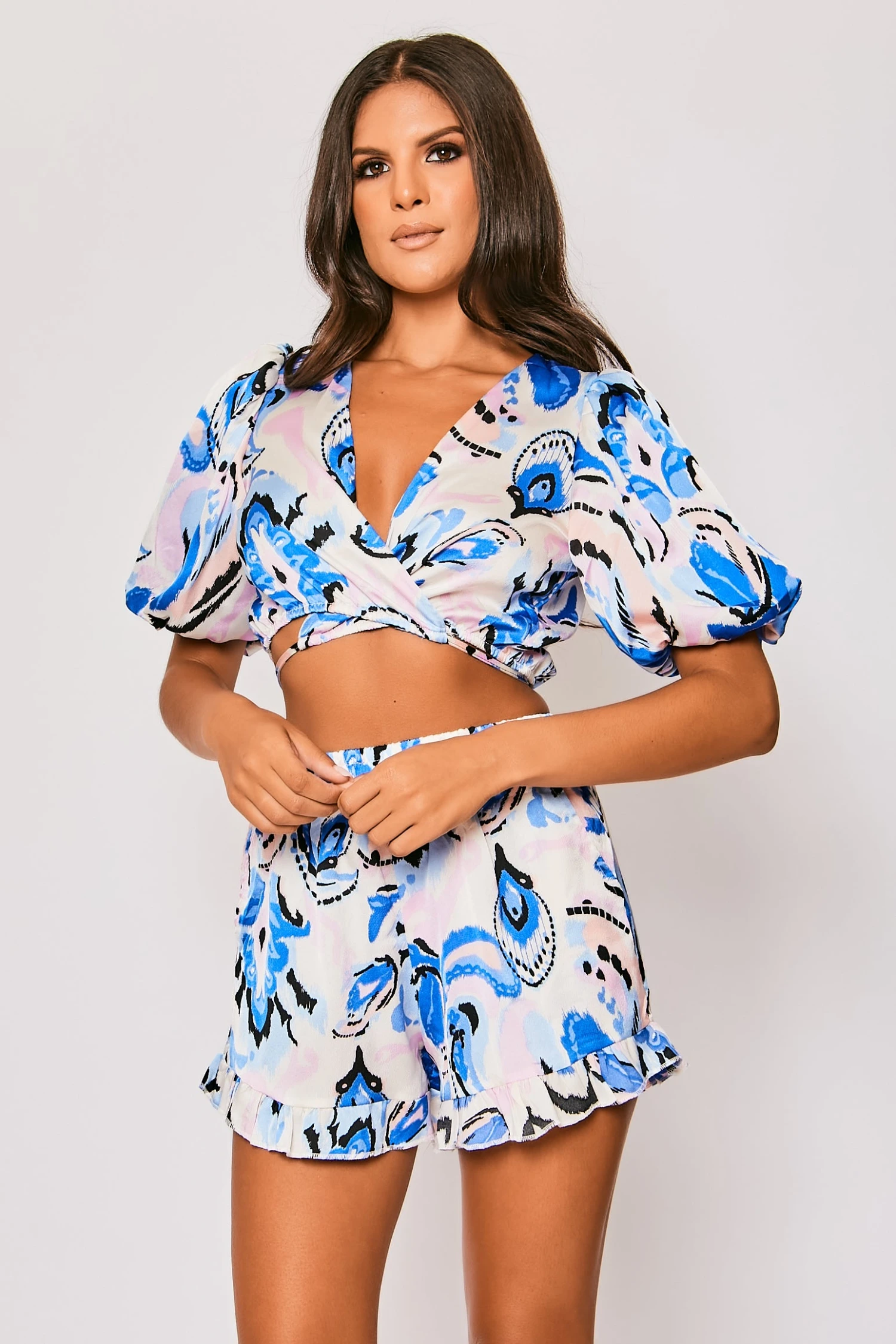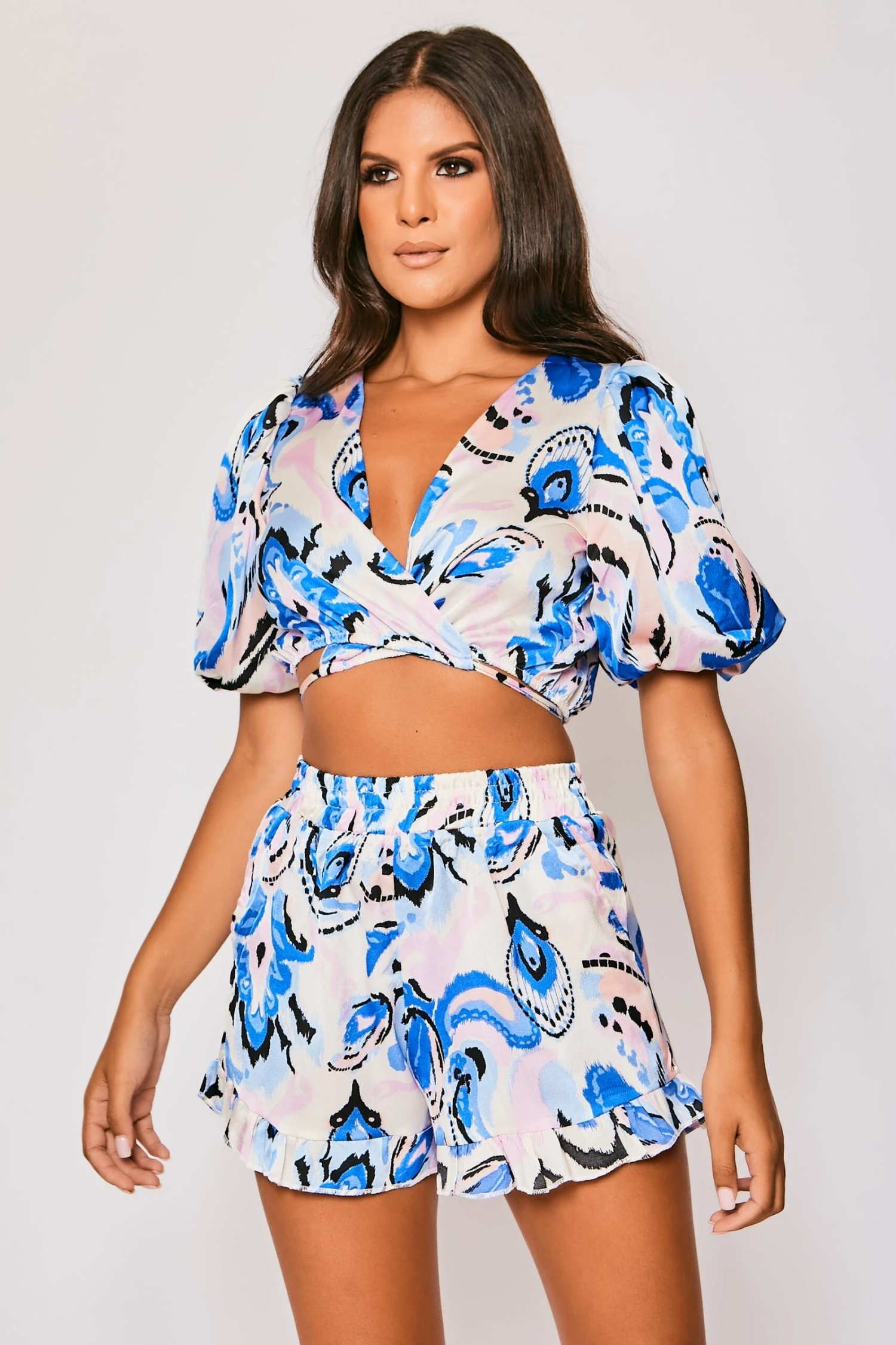 Shyann – Blue Puff Sleeve Tie Front Top & Short Set