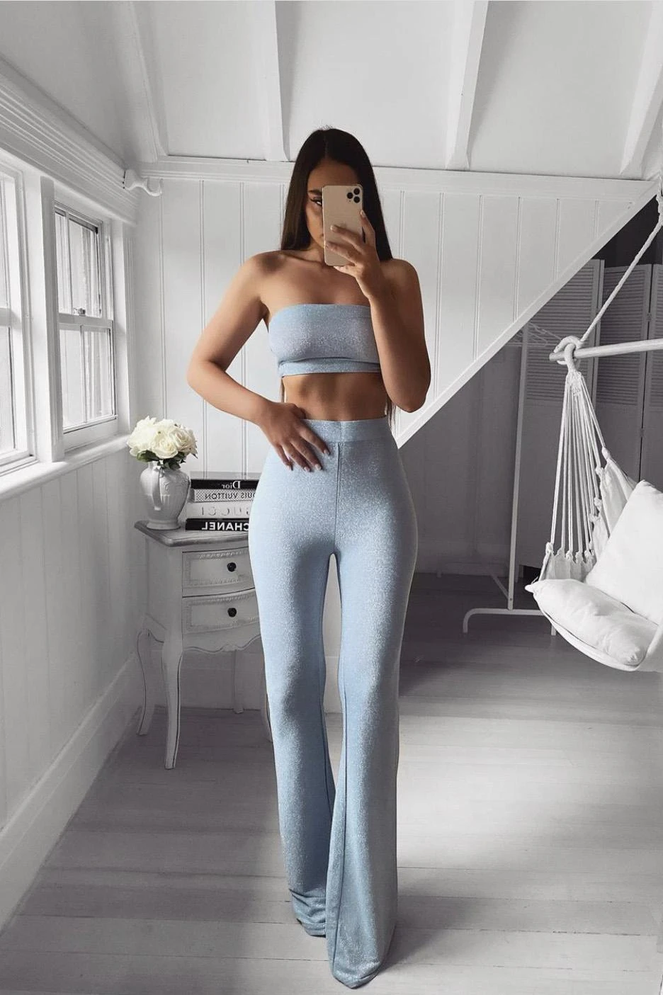 Featuring a bandeau crop top, matching high waisted trousers and a bell bottom finish.